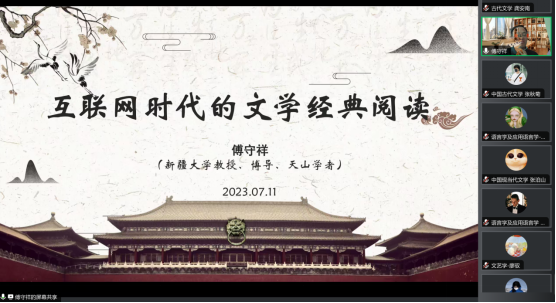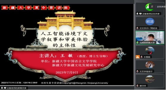 随后,由成湘丽教授主持,邀请新疆大学“天山学者”特聘教授李晓峰老师、傅守祥老师以及新疆大学新疆文化发展研究中心主任、中国语言文学学院教授王敏老师为各位营员带来精彩的专题讲座,提问环节各位营员围绕讲座相关内容积极踊跃地提问,教授们热情耐心而又切中肯綮地进行了积极回应。