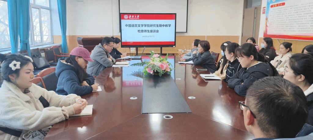 于2023年11月17日下午17:30在9号楼216会议室组织研究生代表开展研究生期中教学检查师生座谈会。会议由学院副院长高志主持,学院二级学科带头人庞海音老师、唐彦临老师、研究生秘书水雪娟老师及研究生班级代表共计20余人参加会议。